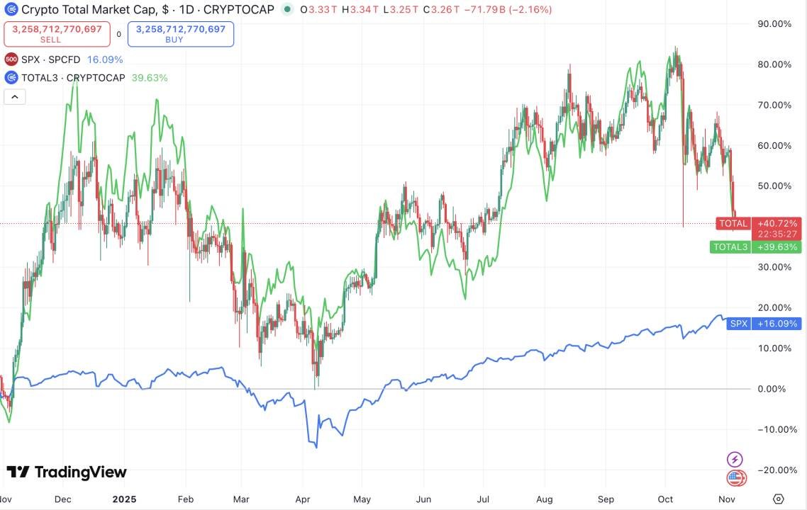 阶段性的宏观逆风、10.11 的行业黑天鹅以及美韩中三国股市的资金竞争导致近期行情下挫;长期美联储的预防式降息,温和的流动性注入带来的买压没有超过 Crypto 新发行资产和代币解锁带来的卖压,表现体现为加密市场总市值的增长但多数币价下跌,造成二级市场投资者体感上的交易熊市。短期关注美国政府开门时间以及美联储缩表结束的生效时间(12月1日);长期关注降息节奏的快慢和加密市场与其他风险市场的资金竞争。